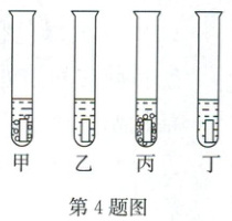 4. A 向装有等量的同种盐酸的四支试管中,分别随机加入相同规格的 Mg、Fe、Cu、Ag 片,若甲和丙均有气泡产生,且丙更剧烈,乙和丁无明显现象(如图),则甲中放置的是(