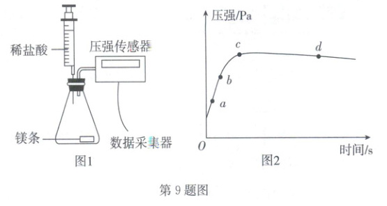 9. B (2025·昆山一模)将镁条和稀盐酸先后加入如图 1 所示的装置中(装置气密性良好),用压强传感器测得密闭容器内压强与时间的关系如图 2 所示。下列说法正确的是(