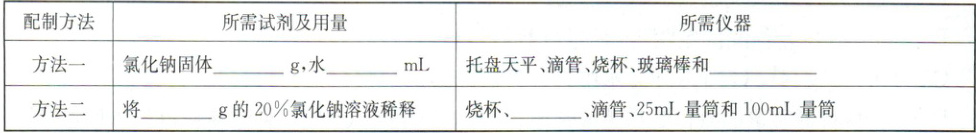 提供试剂:氯化钠固体、$ 20\% $ 氯化钠溶液(密度约为 $ 1.15g/mL $)、蒸馏水(密度约为 $ 1g/mL $);