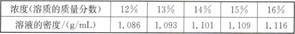 ① $ 20°C $ 时盐水浓度与密度对照如下表。用密度计测定此时盐水的密度为 $ 1.10g/mL $,则该盐水中氯化钠的质量分数约为