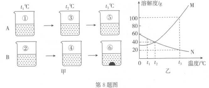 8. 图甲所示为 $ t_1°C $ 时相同质量的 $ A $、$ B $ 两种物质分别溶解在 $ 100g $ 的水中,再将两种溶液分别升温至 $ t_2°C $、$ t_3°C $ 时溶液的变化情况;图乙所示为两种物质的溶解度曲线。下列说法错误的是(