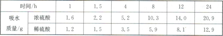 (2)向两个烧杯中分别注入浓硫酸(溶质质量分数为 98%,密度为 1.84g/cm³)和稀硫酸(浓硫酸与水的体积比为 1:1)各 10mL,称量并记录不同时间(h)两种硫酸溶液吸水的质量(g),数据见下表: