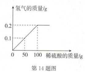 14. B (2025·合肥二模)黄铜是铜锌合金,又称假黄金。为了测定某黄铜样品中锌的质量分数(不考虑黄铜中的其他杂质),向盛有 20g 黄铜粉末样品的烧杯中逐滴加入稀硫酸直至过量,反应生成的氢气的质量与加入稀硫酸的质量关系如图所示(反应生成的另一种物质已全溶于水)。回答下列问题: