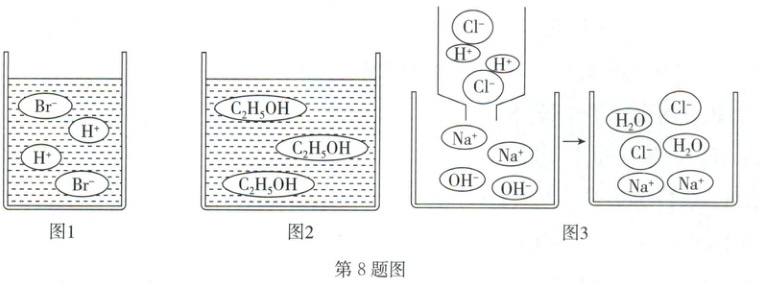 (1)图1和图2分别是溴化氢(HBr)和乙醇(C₂H,OH)在水中的微观示意图。请你结合已有的酸、碱知识,判断溴化氢的水溶液显_(填“酸性”“中性”或“碱性”,下同),乙醇的水溶液显_。