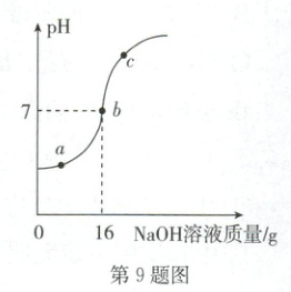 9. B 实验室欲测定一瓶标签破损的稀盐酸的溶质质量分数。现取10g稀盐酸样品,滴入几滴无色的酚酞溶液,然后将5%的NaOH溶液逐滴加入到样品中,边加边搅拌,随着NaOH溶液的不断加入,溶液pH的变化如图所示。试回答: