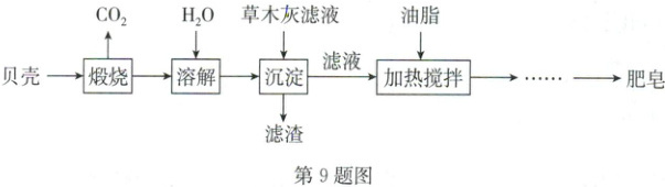 9. B 某小组同学以贝壳(主要成分为${CaCO_{3}}$)、草木灰(含${K_{2}CO_{3}}$)和油脂为原料,模拟古法制肥皂,实验室操作流程如图。已知:油脂密度小于水,难溶于水;在碱性、加热条件下生成的物质可溶于水。