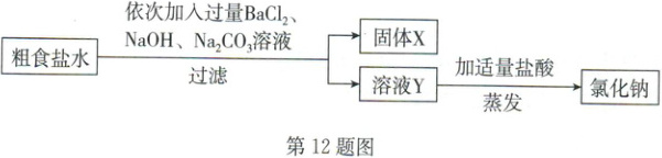 12. C 粗食盐中含有泥沙和$MgCl_{2}$、$CaCl_{2}$、$Na_{2}SO_{4}$杂质。某同学将粗食盐样品溶解、过滤,除去泥沙后,取粗食盐水按以下流程进行提纯。