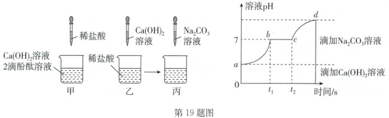 (2)往烧杯乙中逐滴滴入一定体积的某浓度$Ca(OH)_{2}$溶液,待反应结束后,用$26.5\%$ $Na_{2}CO_{3}$溶液继续滴加,利用仪器收集、记录相关数据并绘制出“溶液$pH -$时间”变化曲线(如图所示),请写出$pH$由$a\to d$过程中,烧杯丙中发生反应的化学方程式:。