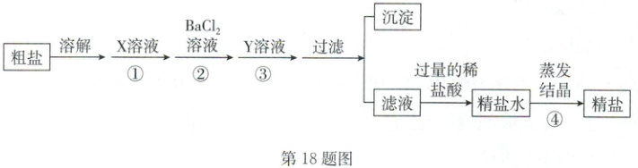 18. B 除去泥沙后,有的粗盐中含有$CaCl_{2}$、$MgCl_{2}$、$Na_{2}SO_{4}$等可溶性杂质,还需要进一步除杂精制。