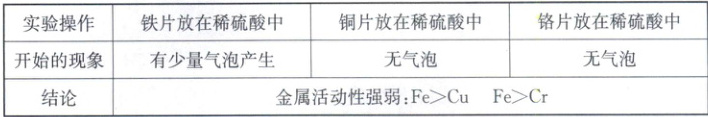 【设计与实验】①张明同学取大小相等的铁、铜、铬三种金属片,未经打磨就分别放入等量、等浓度的稀硫酸中,记录如下表: