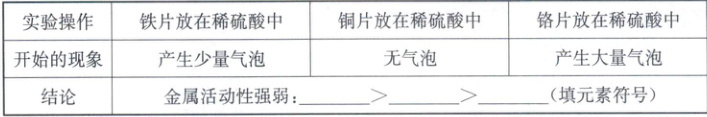 $ Hg\ Ag\ Pt\ Au $(在横线上填写对应金属的元素符号)【作出猜想】猜想①:$ Cr > Fe > Cu $;猜想②:$ Fe > Cu > Cr $;猜想③: