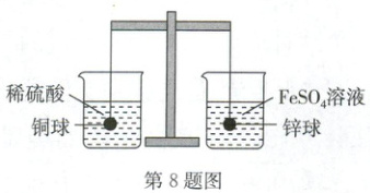 8. B (2024·四川雅安一模)某小组同学利用杠杆原理设计如图所示实验,实验前在杠杆的两端分别挂质量相等的铜球和锌球(均已打磨),此时杠杆平衡,然后将两个金属球分别浸没在盛有稀硫酸和 $ FeSO_4 $溶液的烧杯中进行实验。下列有关说法不正确的是 (