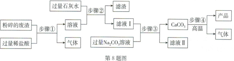 8. (2025·河北)高纯氧化钙是一种重要的化工原料。如图所示为小组同学以某工厂废渣(主要成分为 $ CaCO_3 $,含少量 $ Fe_2O_3 $ 和 $ MgCO_3 $)为原料,在实验室制备高纯氧化钙的实验方案。