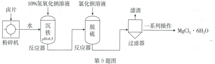 9. (2025·武汉)氯化镁产品大多数是黄褐色或白色固体,习惯称为卤片。某卤片的主要成分为 $ MgCl_2 $,还含少量 $ MgSO_4 $、$ NaCl $ 和 $ FeCl_3 $,以该卤片为原料生产 $ MgCl_2 · 6H_2O $ 的工艺流程示意图如下所示。