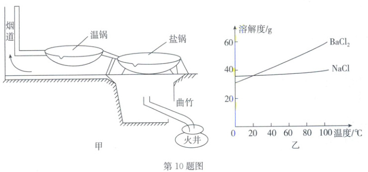 10. (2025·湖北)抗日战争时期,范旭东创办的黄海化学工业研究社(以下简称“黄海社”)西迁至四川,积极开展盐业研究。黄海社了解到当地存在一种困扰人民多年、病因未明的痹病,该社秉持“在原则上绝对地相信科学,在精神上以能服务社会为最大光荣”的理念,研究确认痹病是由当地人食用含 $ BaCl_2 $ 的井盐中毒引起。