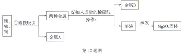 12. C 为达到收旧利废、节能减排的目的,从含有金属镁、铁、铜的粉末中,分离和提取出重要化工原料 $ MgSO_4 $和有关金属,实验过程如图,请回答: