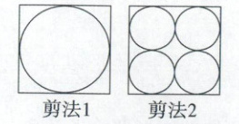 13. 从两张相同的正方形铁皮上分别剪下不同规格的圆片(如图),剩下的材料相比,()。