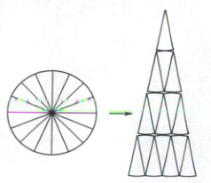14. 圆面积公式的推导有不同的方法。奇奇把圆平均分成16份,得到16个大小相等的小扇形,再把这些小扇形拼成一个近似的三角形(如图)。如果三角形的底是6.28 cm,那么三角形的高约是()cm。
