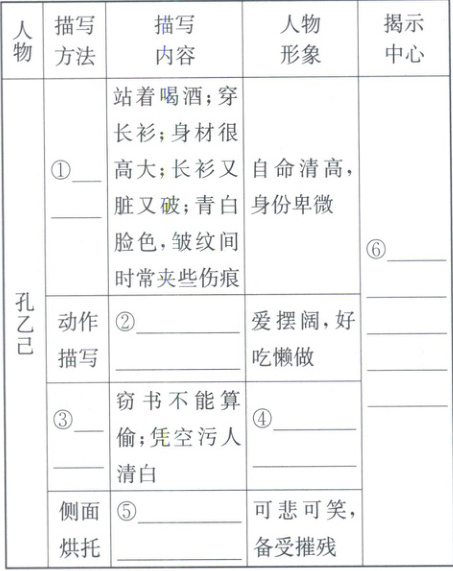 3. ①外貌描写 ②排出九文;摸出四文 ③语言描写 ④自欺欺人,迂腐不堪 ⑤短衣帮嘲笑;丁举人殴打 ⑥科举制度对知识分子的毒害