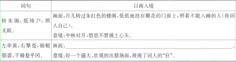 8. “以画入境”能更好地理解词句。读苏轼的词,眼前会有很强的画面感。仿照示例,请将下面表格补充完整。(2分)