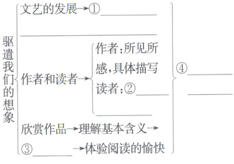 2.①歌谣—文艺和文字—文字的集合体 ②通过文字接触作者的所见所感 ③驱遣想象 ④驱遣想象,欣赏作品