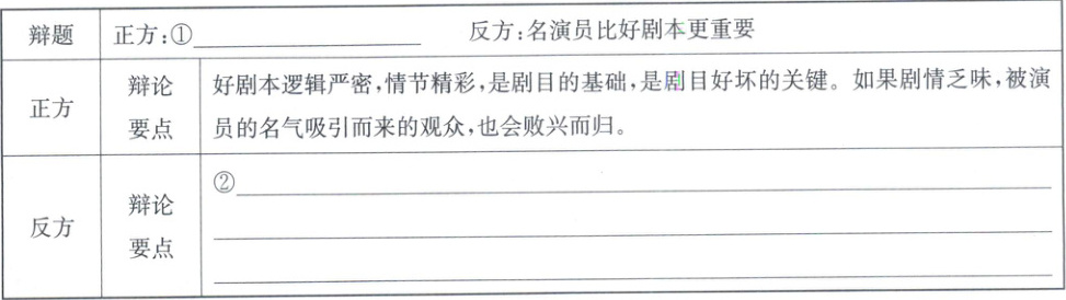 (3) 【任务三:提纲补充】演出引发热议,大家就剧本和演员的重要性展开辩论,请完成下面的辩论提纲。(4分)