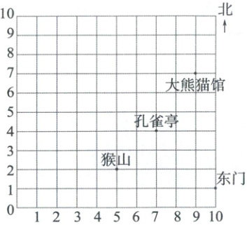 4. (1) 某动物园的平面图如图所示。猴山的位置用$(5,2)$表示,请你在图上标出金鱼湖$(6,6)$、狮虎山$(3,8)$、北门$(2,10)$的位置。