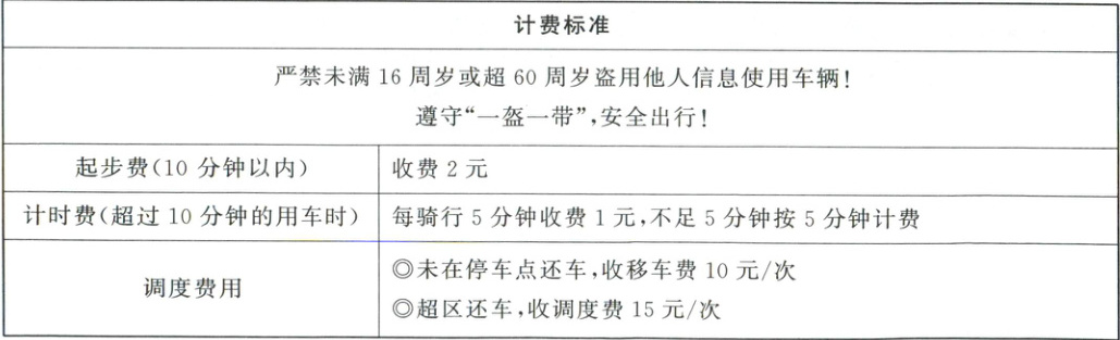 (1) 王叔叔骑共享电动车从家到公司用了$18.5$分钟,如果无调度费用,那么共需付费多少元?