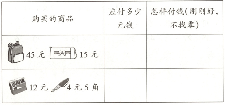 2.60元 1张50元和1张10元 16元5角 1张10元、1张5元、1张1元、1张5角 (画横线的答案不唯一)