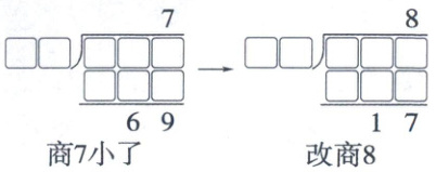 7. 计算除数是两位数的除法时,除数的个位上是$3$,用“四舍五入”法试商时,商往往(