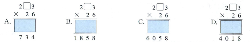 23. 下面是四名同学计算“$2□3×26$”的竖式,中间的乘积被遮住了,其中正确的是( )。