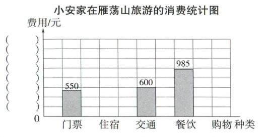 (3)住宿费比门票费的2倍多100元,交通费是购物费的2倍。请在统计图中补充住宿费和购物费。