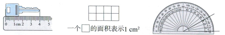 24. 下图中,钥匙的长度是( )$cm$,大长方形的面积是( )$cm^{2}$,角的大小是( )°。