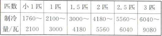 空调总制冷量在3600瓦到4320瓦,根据图示可知:1.5匹制冷量为3000瓦~4180瓦 2匹制冷量为4180瓦~5560瓦 综合考虑应该选择大的,即2匹的