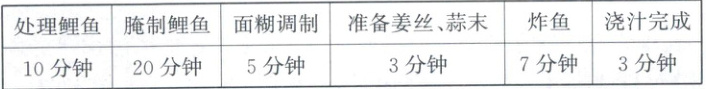 4. 糖醋鲤鱼外脆里嫩,酸甜可口,是济南的传统名菜之一。做糖醋鲤鱼的过程可以用下表来表示,那么一道糖醋鲤鱼至少要用()分钟完成。