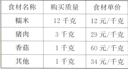 (2)班级采购小组结合市场调查制定以下采购清单(供80人食用),你能计算每份糯米饭的制作成本吗?(结果保留整数)(3分)