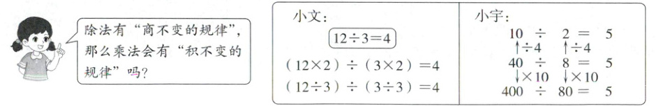 23. 本学期我们探究了“商不变的规律”:被除数和除数都乘或除以一个相同的数(0 除外),商不变。下面是小文和小宇举例说明自己对这一规律的理解。
