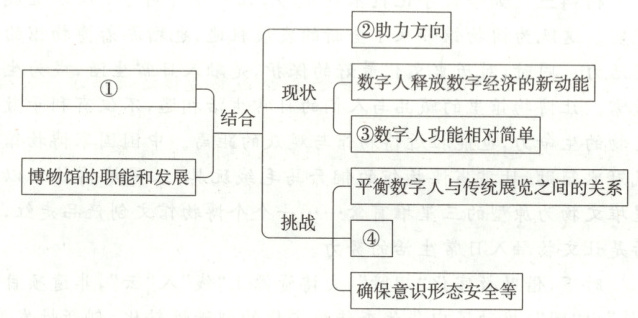 6.C [命题立意]本题考查理解材料有关内容的能力。 [解析]③“数字人功能相对简单”对应的是材料二第三段“然而,目前博物馆推出的数字人都相对简单,基本集中在‘宣传展示型’代言人和‘观众服务型’引导员两种”。材料二第四段主要说的是博物馆数字人应在内容建构上下功夫,而不应该只是具备美观的外表。故选C。