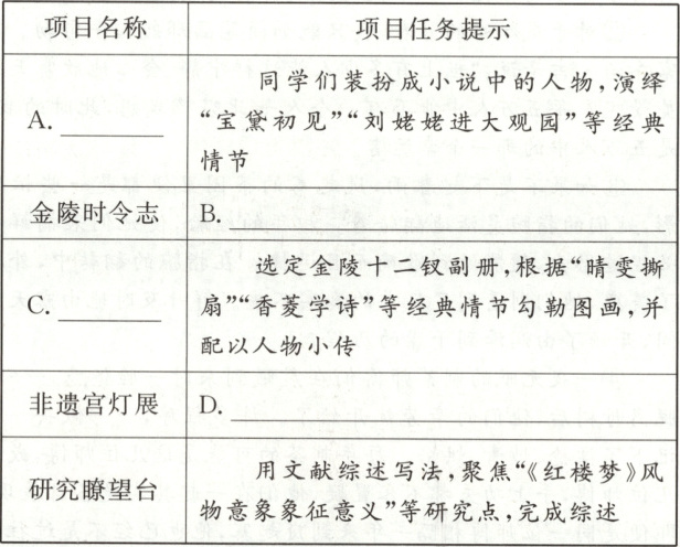 (2)某中学以项目式学习的方式组织《红楼梦》研学活动,拟策划"《红楼梦》阅读嘉年华"文化节,并以海报展示。下表是海报的相关内容,请根据"项目名称"和"项目任务提示"示例,将海报补充完整。