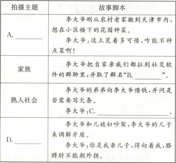 (1)某中学以系列视频短剧方式组织《乡土中国》研学活动,计划拍摄"寻找城市中的'乡土'气息"系列短视频,下面是拍摄计划的相关内容。请根据"拍摄主题"和"故事脚本"示例,将拍摄计划补充完整。