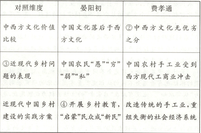 5.C [命题立意]本题考查理解材料有关内容的能力。 [解析]由第二段“之所以重视识字教育,是因为他发现中国农村的弊端是‘愚’‘穷’‘弱’‘私’”和第五段“他认识到:中国农村的真正问题是‘人民的饥饿问题’”“然而,随着西方现代工商业的冲击……农民便‘站在饥饿边缘上了”可知,③处应为“近现代乡村问题的原因”。 故选 C。