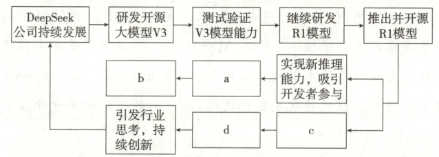 4. 阅读材料一后,有同学画出了DeepSeek撼动全球AI市场过程的流程图,请你推理流程图a、b、c、d处所对应的材料内容依次是(