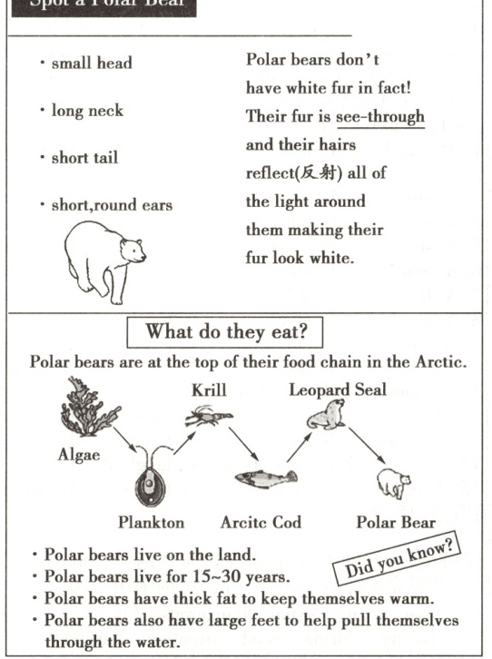 4.C 【解析】根据图片中的“Polar bears have thick fat to keep themselves warm”可知,北极熊有厚厚的脂肪可以保暖。故选C。