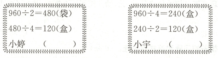 4. 蛋糕房做了960个蛋糕,每2个蛋糕装1袋,每4袋装1盒。这些蛋糕可以装多少盒?下面是两名同学的计算方法。