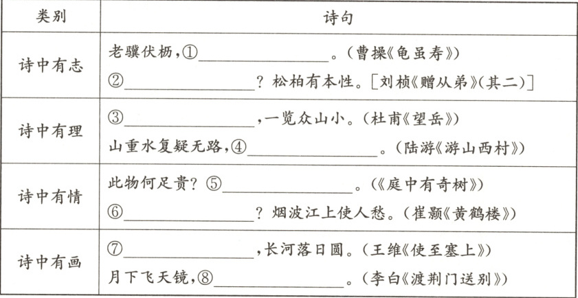 6. ①志在千里 ②岂不罹凝寒 ③会当凌绝顶 ④柳暗花明又一村 ⑤但感别经时 ⑥日暮乡关何处是 ⑦大漠孤烟直 ⑧云生结海楼