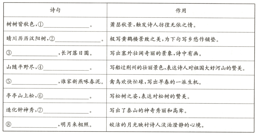 5.(8分)“一切景语皆情语”,古诗情景交融,情因景而物化,景因情而意象化。在“诗中有景,景中有情”活动中,小澄和小雯搜集了以下资料,请你帮他们补充完整。