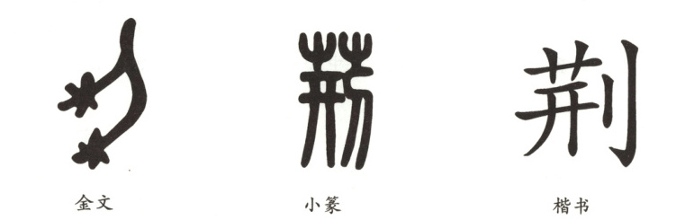 "荆"字早期的金文字形,右边是一个人形,左边两个"X",表示一种刺,整个字形画面表示荆这种刺___。"荆"在《康熙字典》中的注解是"古者杖以荆,故字从刑""荆楚之地,因多产此而名也"。