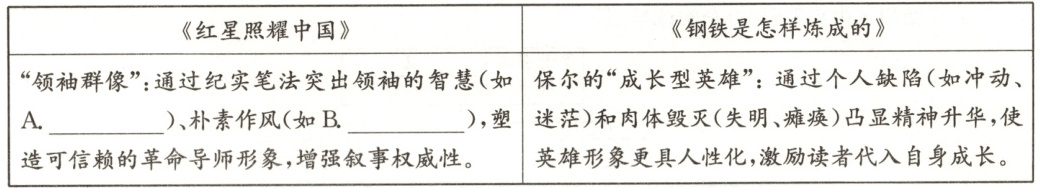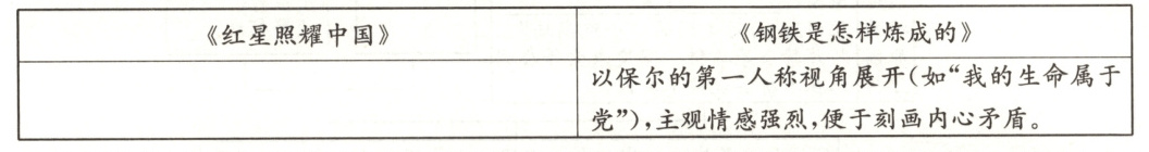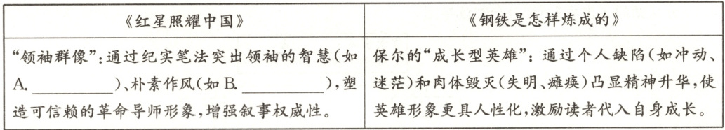下面表格展示了同学们研读《红星照耀中国》和《钢铁是怎样炼成的》的部分成果,请你相互参照,完成下面小题。