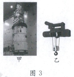 7. 如图3甲所示,工作人员正在组装神舟飞船。用图3乙所示的电动滑轮将质量为2t的飞船部件在10s内匀速提升2m,电动滑轮的机械效率为80%(g取10N/kg),以下分析正确的是(