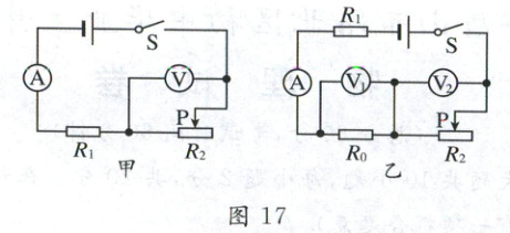 20. (6分)如图17甲所示,电源电压保持不变,电压表量程为0~15V,电流表量程0~3A,定值电阻R₁的阻值为10Ω,滑动变阻器R₂标有“60Ω 2A”。闭合开关S,移动滑动变阻器的滑片P到某位置时,电压表示数为9V,电流表示数为1.5A。